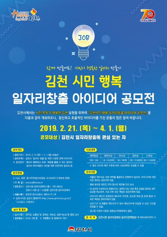 | 김천시(시장 김충섭)는 참신하고 창의적인 일자리 정책 모델을 발굴하고자 “시민이 행복한 일자리 창출 아이디어”를 2월21일부터 4월 1일까지 공모한다.