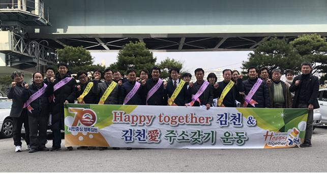 | 김천시(시장 김충섭)에서 민선 7기의 출범과 시승격 70주년을 맞아 역점적으로 추진하고 있는‘대한민국에서 가장 친절한 도시 김천’을 목표로 한 시민의식 변화 프로젝트인“Happy together 김천운동”에 김천지역 건축사회(회장 송동훈)가 적극 동참하기로 했다.