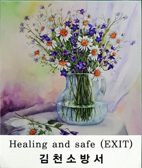 특히, 김천예술고등학교 학생들의 디자인 재능기부를 통해 제작된 피난도움스티커는 평소에는 입소자에게 힐링이 되는 그림이 되고, 야간에는 자체 축광 기능으로 피난에 도움을 주는 형태로 만들어졌다.