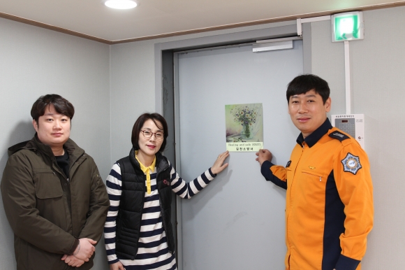 이번 소방안전대책은 요양병원 및 시설의 출입구와 비상구에 아름다운 그림이 그려진 피난도움스티커와 경보기를 부착하여 관계자 및 입소자에게 피난시설에 대한 친밀감을 형성하였다.