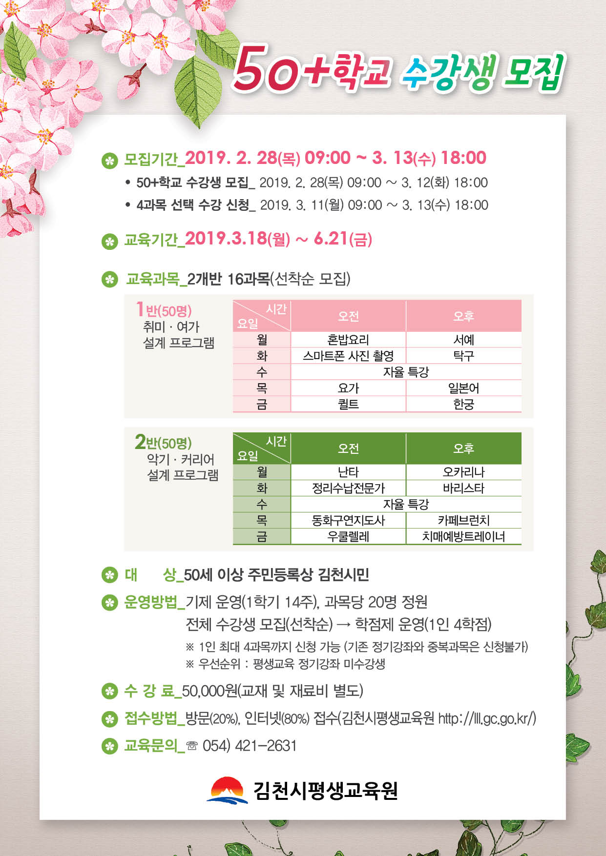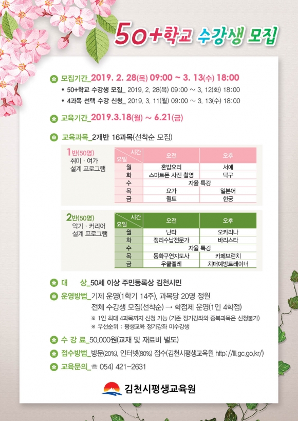 모집기간은 2월 28일부터 3월 13일까지 주민등록상 김천시에 주소를 둔 50세 이상 시민은 누구든지 신청할 수 있으며, 수강을 희망하는 경우 김천시평생교육원 방문 또는 인터넷(http://lll.gc.go.kr/) 신청 가능하다.