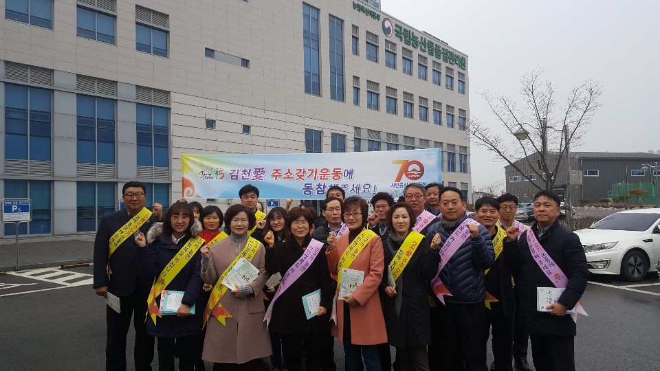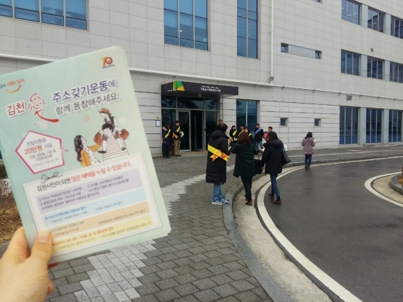 | 김천시 시민생활지원과(과장 최주섭)외 3개 부서에서는 2월 27일(수) 오전 8시부터 김천혁신도시 내 국립농산물품질관리원 본원을 방문하여「김천愛 주소갖기 운동」및「Happy together 김천 친절질서청결운동」합동캠페인을 실시하였다. 이날 캠페인에서는 시민생활지원과를 비롯하여 세정과, 회계과, 정보기획과 직원 30여명이 공공기관 직원 및 방문객을 대상으로 김천시 전입홍보물 및 출산관련 보건혜택 리플릿을 배부하며 김천愛 주소갖기 운동과 친절질서청결운동 생활화에 적극적인 동참을 호소하였다.