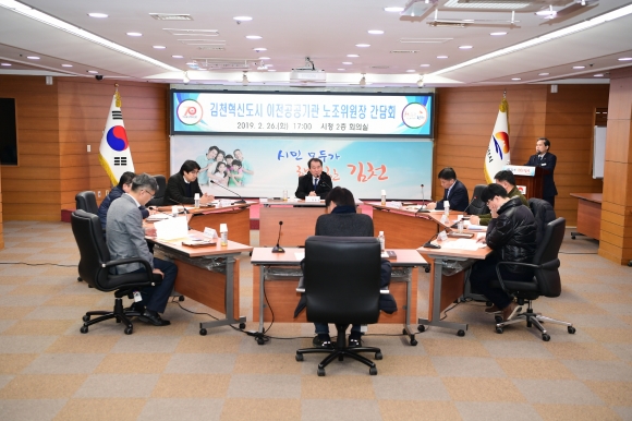 | 김충섭 김천시장은 지난 2월 26일 시청 회의실에서 혁신도시 공공기관 노조위원장(지부장)과 소통의 시간을 마련했다.