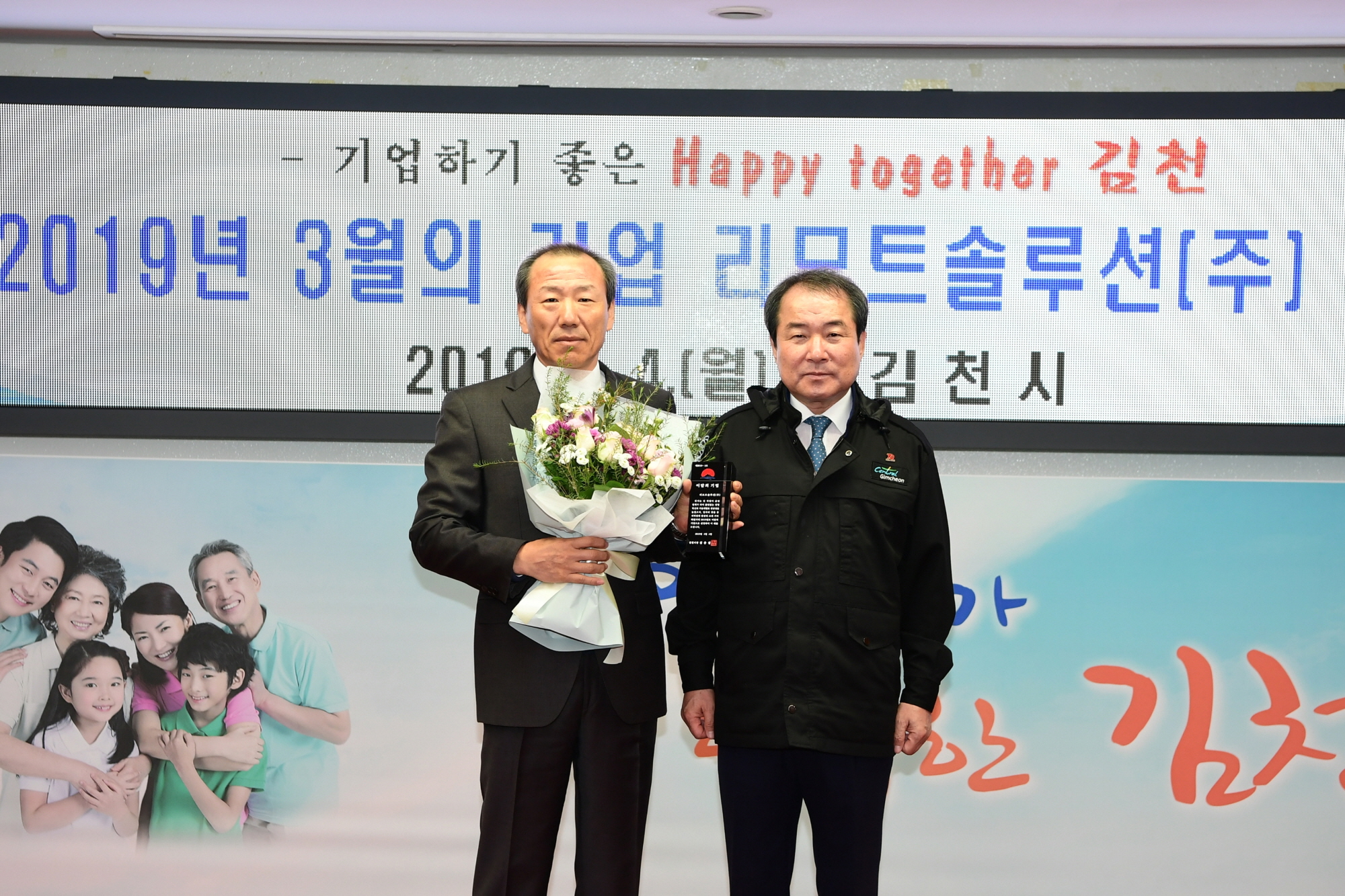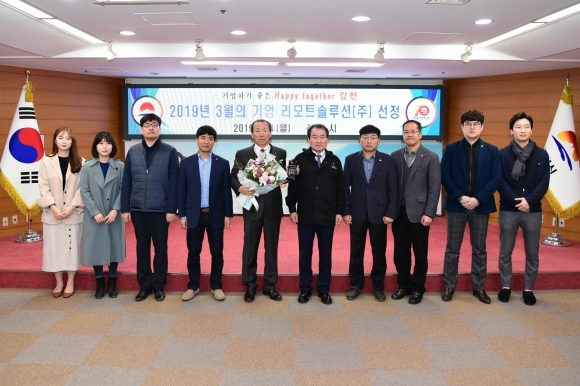 3월에 선정된 이달의 기업은 김천시 남면에 소재하고 있는 글로벌 리모콘 생산업체인 리모트솔루션으로 3월 4일 박석규 부사장 및 임직원 등 40여명이 참석한 가운데 선정패 수여식 및 회사기 게양식을 개최하였다.