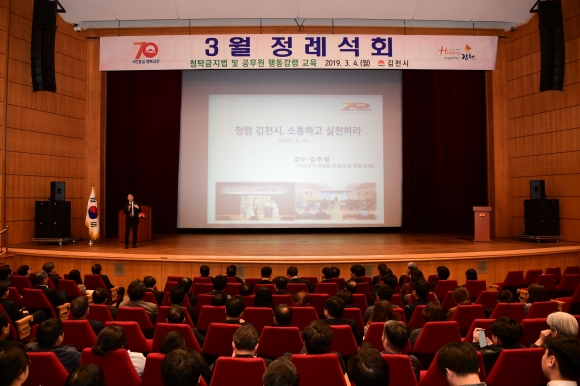 | 김천시(시장 김충섭)는 지난 4일 김천시문화예술회관 대공연장에서 전 공무원을 대상으로 공직사회 청렴분위기 확산을 위한 청렴교육을 국민권익위원회 청렴 전문강사를 초빙하여 실시했다.