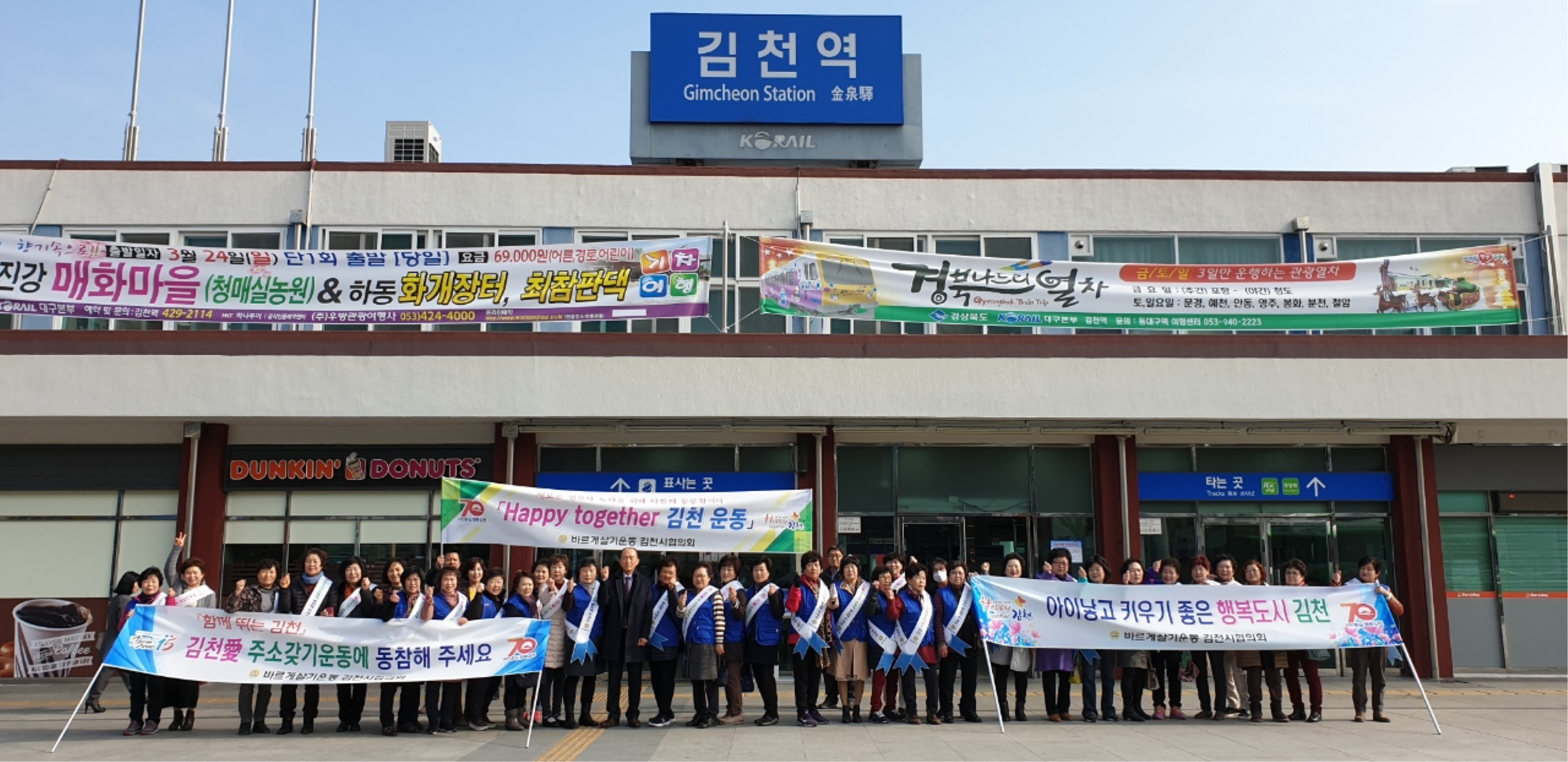 | 바르게살기운동김천시협의회 여성봉사회(회장 김명옥)는 홍순용 바르게살기운동김천시협희장 및 여성봉사회 회원 50여명이 참여한 가운데 3월 4일 오전 10시부터『Happy together 김천』운동을 홍보하는 가두 캠페인을 펼쳤다.