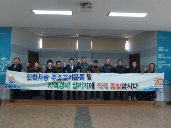 3월 7일 김천시 일자리경제과에서는 황금시장 상인회원들과 황금시장 상인회관에서 김천愛주소갖기 및 「Happy together 김천 운동」실천 캠페인 및 결의대회를 가졌다.