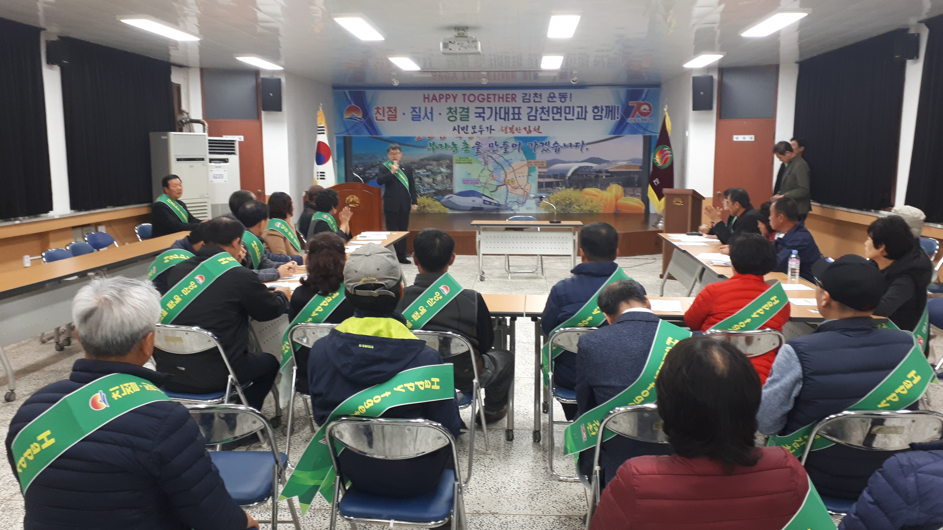김천석 감천면장은 인사말에서 “젊은이들이 고향을 떠나가는 현실에서 귀농 귀촌인 여러분들이 15만 인구회복에 큰 역할을 해주고 있는데 감사드린다. 도시의 환경과 농촌의 정서는 다르겠지만 주민들과 화합해서 행복한 전원생활이 되기를 바라며 범시민운동으로 추진하고 있는 Happy together 김천 운동도 가정에서 부터 동참해서 앞으로 더 많은 귀농 귀촌인이 김천을 찾아올 수 있는 계기가 되기를 희망한다.”고 말했다.