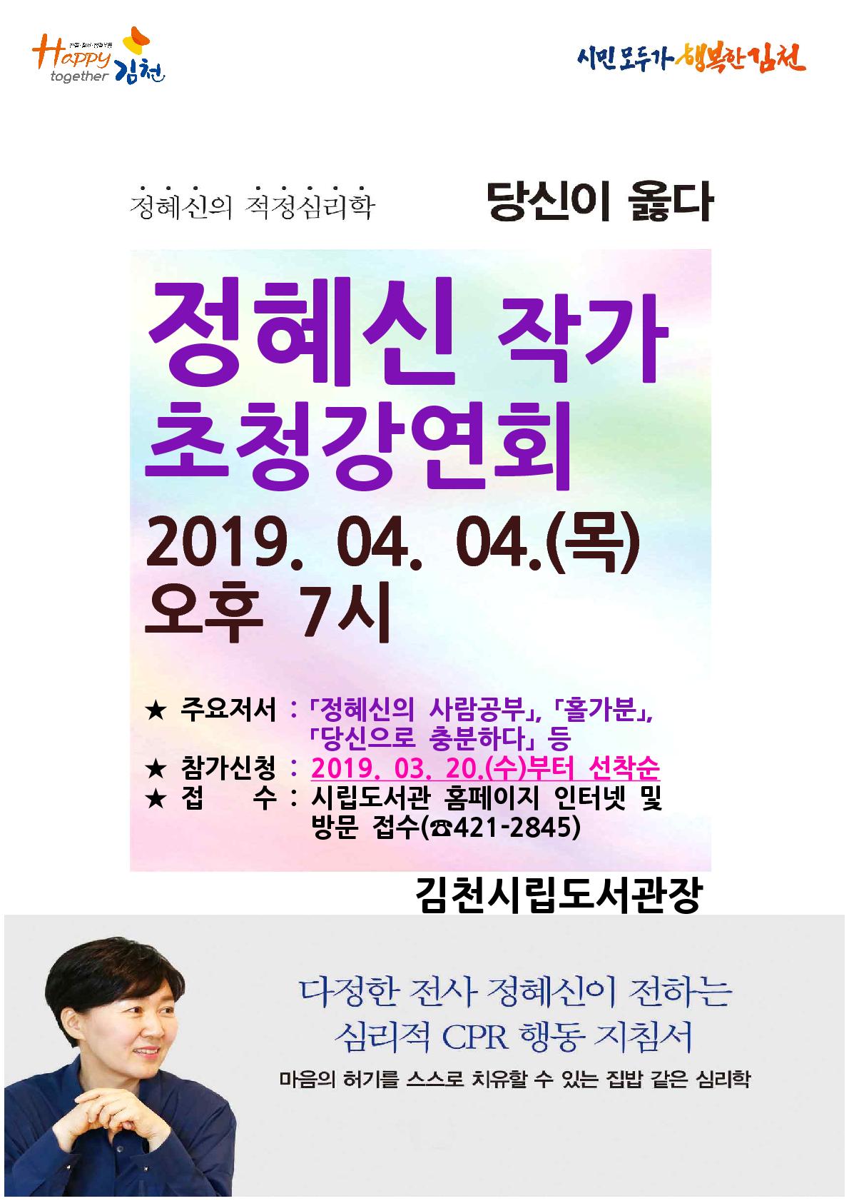 | 김천시립도서관은 4월 4일, 도서관 시청각실에서「당신이 옳다」의 저자이자 정신과전문의인 정혜신 작가를 초청하여 강연회를 개최한다.