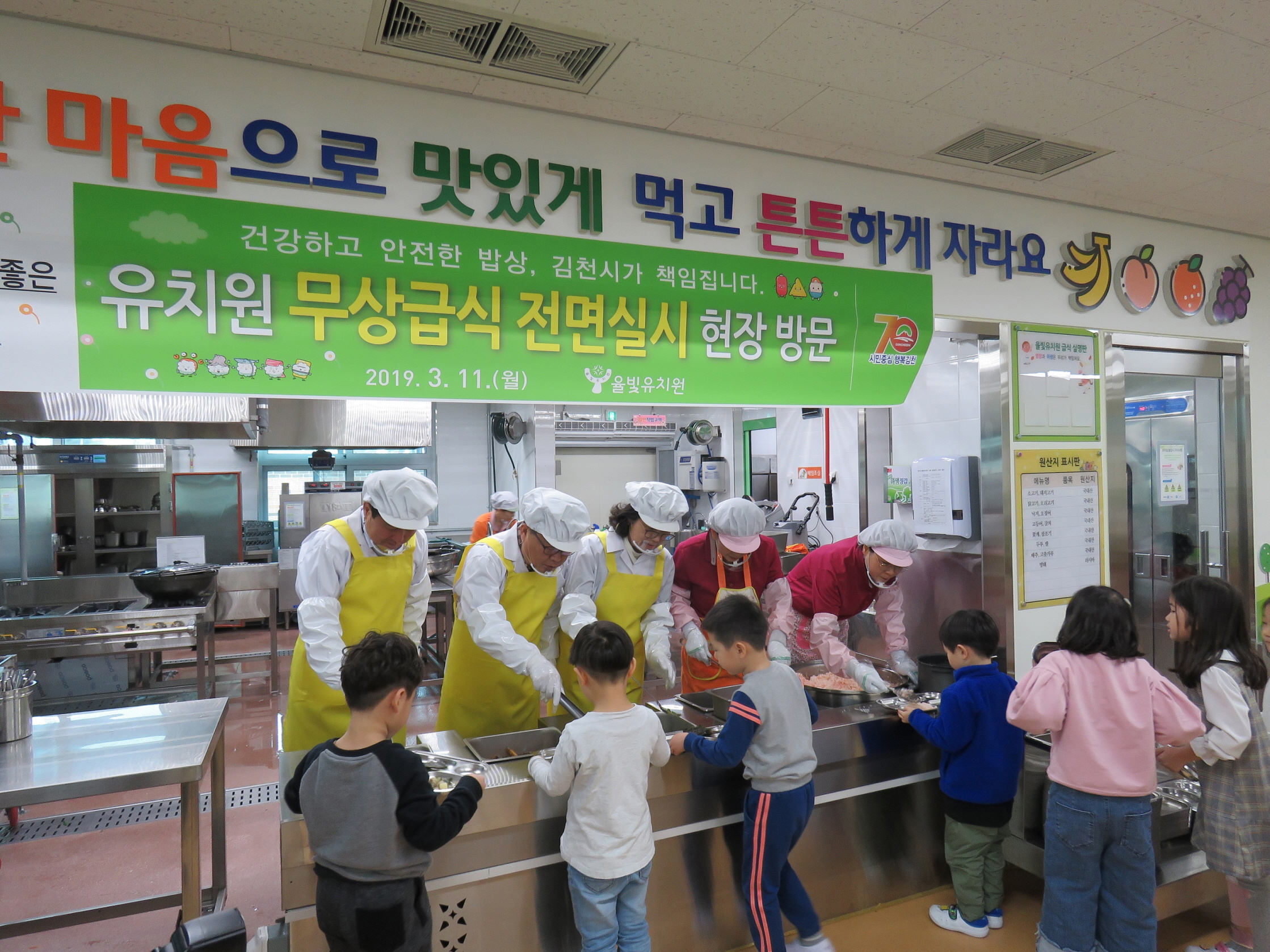 | 3월 11일 김충섭 김천시장, 김세운 김천시의회 의장, 마숙자 김천교육지원청교육장님들이 유치원 무상급식 현장 상황을 돌아보기 위해 율빛유치원(원장 유정희)에 현장 방문을 하였다.