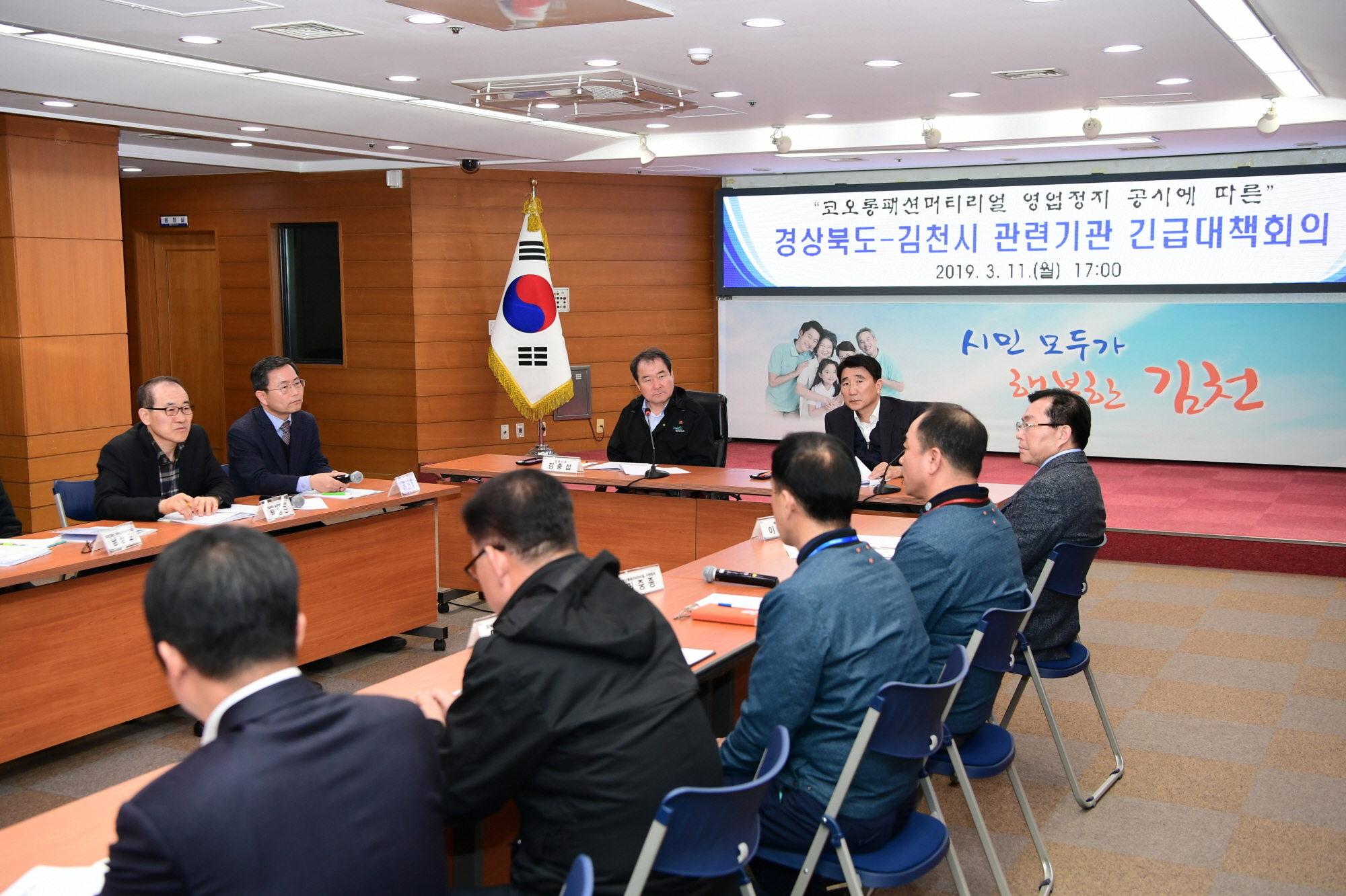 | 경상북도와 김천시가 지난 3월 11일 오후 코오롱패션머티리얼(주)(이하 코오롱FM) 영업정지 공시에 따른 관련기관 긴급 대책회의를 김천시청 회의실에서 가졌다.