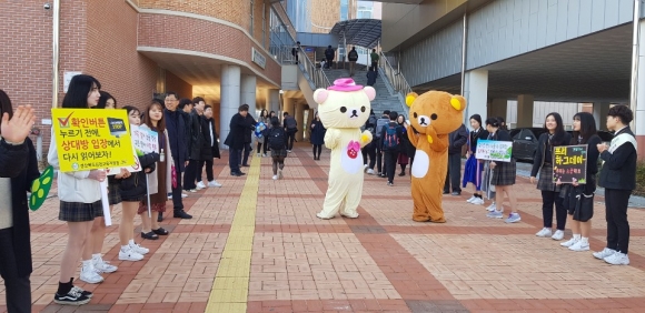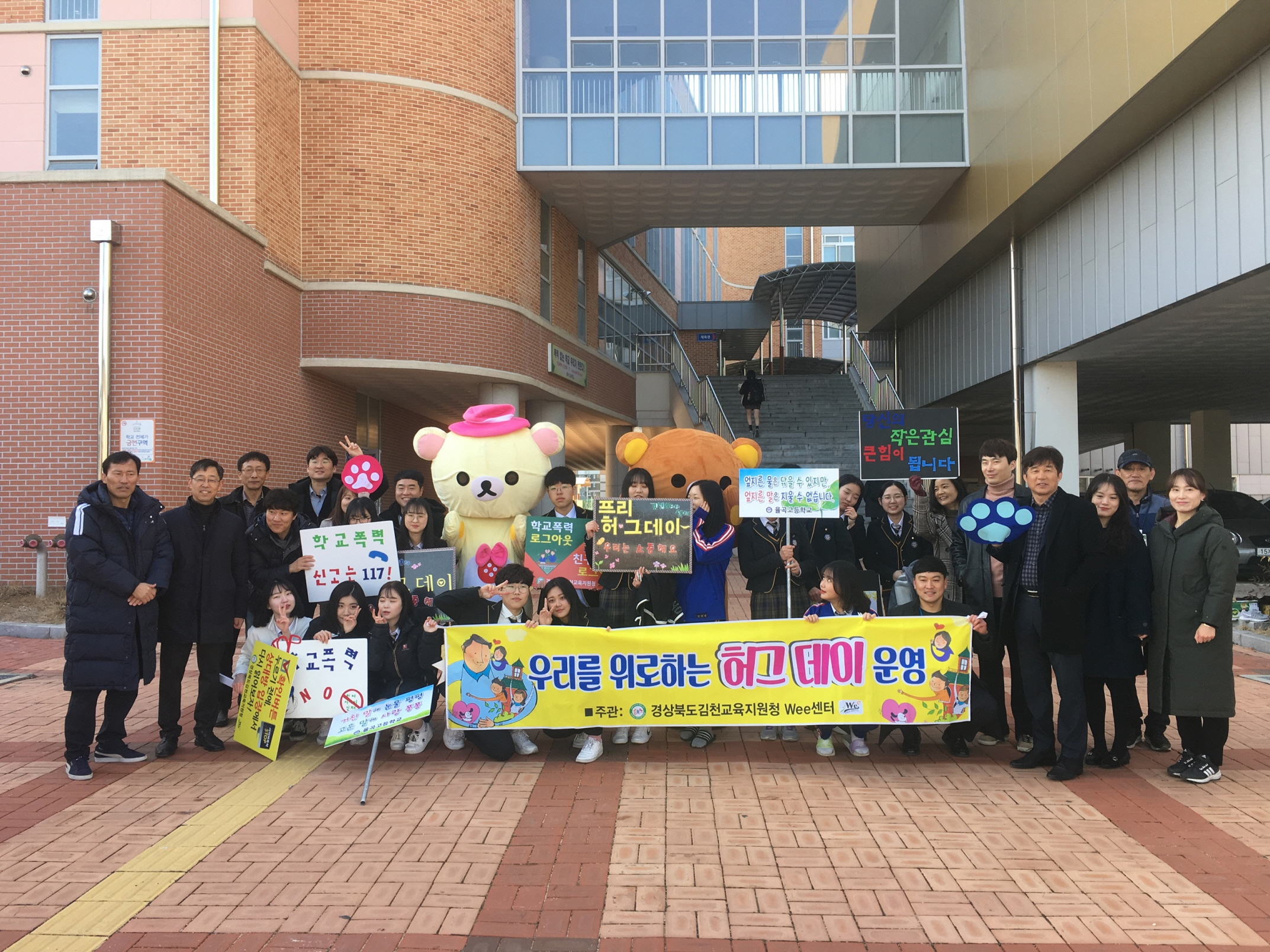 | 경상북도김천교육지원청(교육장 마숙자) Wee센터는 3월 13일 율곡고등학교 정문에서 등교하는 학생 300여명을 대상으로 ‘우리를 위로하는 허그(Hug) 데이, 하이파이브 데이’ 행사를 하였다.