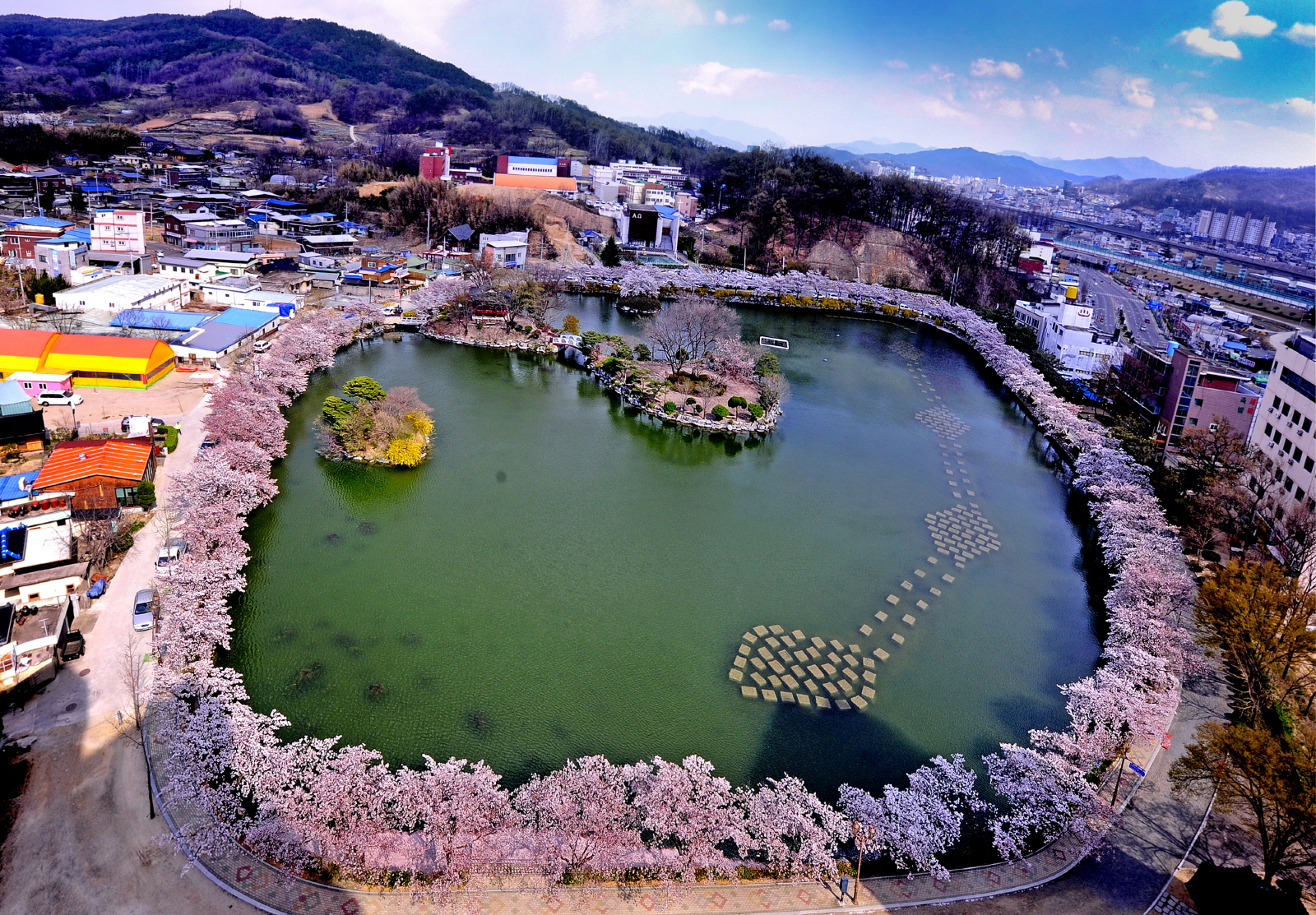 ▲ 김천에는 교동 연화지 둘레길이 SNS 입소문을 통해 널리 알려져 있다. 김천시에 따르면 연화지 벚꽃은 하늘에서 내려다 본 가장 아름다운 벚꽃이라고 한다. 한편 올해 경북의 벚꽃 개화시기는 경주는 3월 27일, 안동은 4월 2일이라고 한다. 보통 개화시기로부터 4~5일이 절정기라고 할 수 있으니 짧은 기간을 놓치지 않아야 가장 화려한 벚꽃을 볼 수 있다.