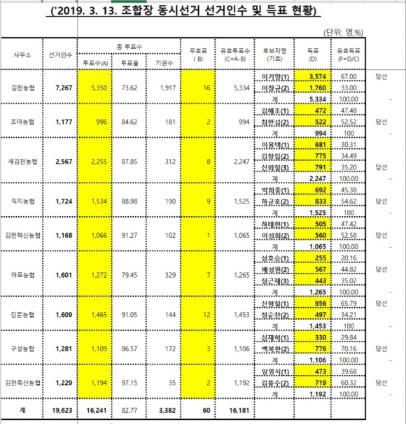 김천시 선거관리위원회는 3월13일 실시한 김천지역 제2회 전국 동시조합장선거 당선자를 발표했다.