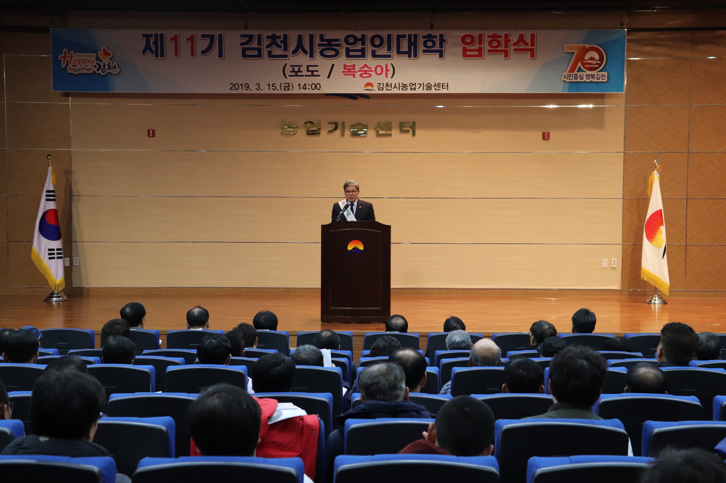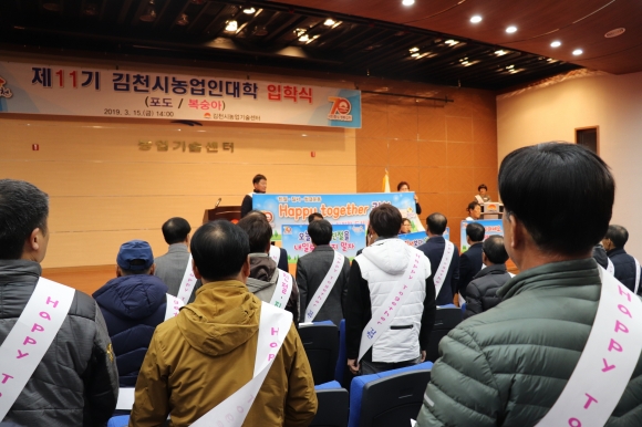 | 김천시(시장 김충섭)는 지역 농업의 특화발전에 필요한 품목별 장기 핵심교육 실시로 과학영농 실천능력을 갖춘 전문 농업 경영인 양성을 위하여 3월 15일 입학생 111명을 대상으로 제11기 김천시농업인대학 입학식을 개최하였다.