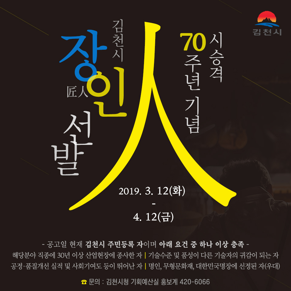 시 관계자는 “장인 선발은 고희(古稀)가 된 김천에 의미 있는 역사적 기록이 될 것”이라며 “김천의 역사만큼 다양한 분야에 능력 있는 장인들을 추천 바란다.”고 했다.