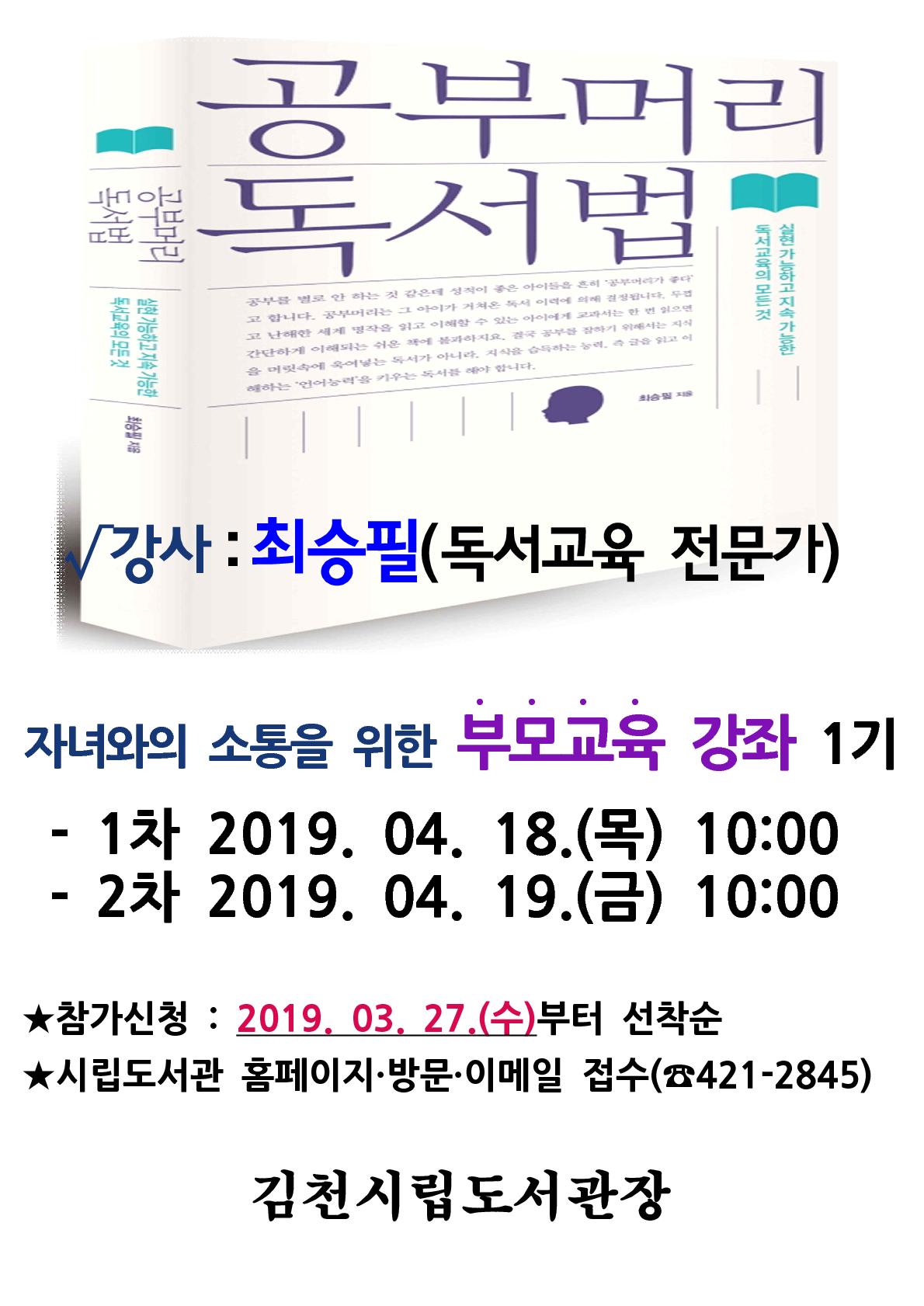 | 김천시립도서관은 교육 주체로서의 부모역할 정립과 올바른 자녀 양육을 위해 4월과 6월, 총4회에 걸쳐〔부모교육〕강좌를 개최한다.