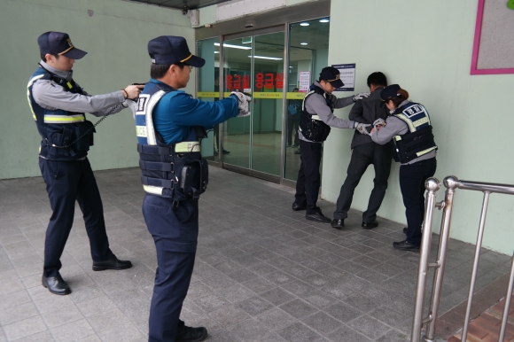 이날 훈련은 김천의료원 응급실에 의료진 상대 흉기 난동 환자가 있다는 가상의 시나리오를 설정, 양방향 비상벨을 통한 신고접수, 상황전파, 신속출동, 공조요청, 검거 등 전 과정을 실전처럼 훈련하였다.