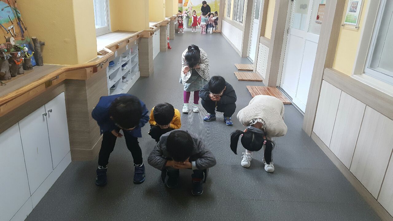 소방대피훈련 경보 방송이 울리자 유아들은 식속하게 수건으로 입과 코를 막으며 교실 밖으로 교사의 인솔 아래 신속하게 대피하였다.