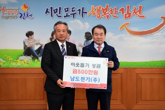 | 김천시 감천면에 위치한 남도전기(주)(대표 장현우)는 지난 3월 22일 김천시청을 방문해 이웃돕기 성금 500만원을 전달했다.