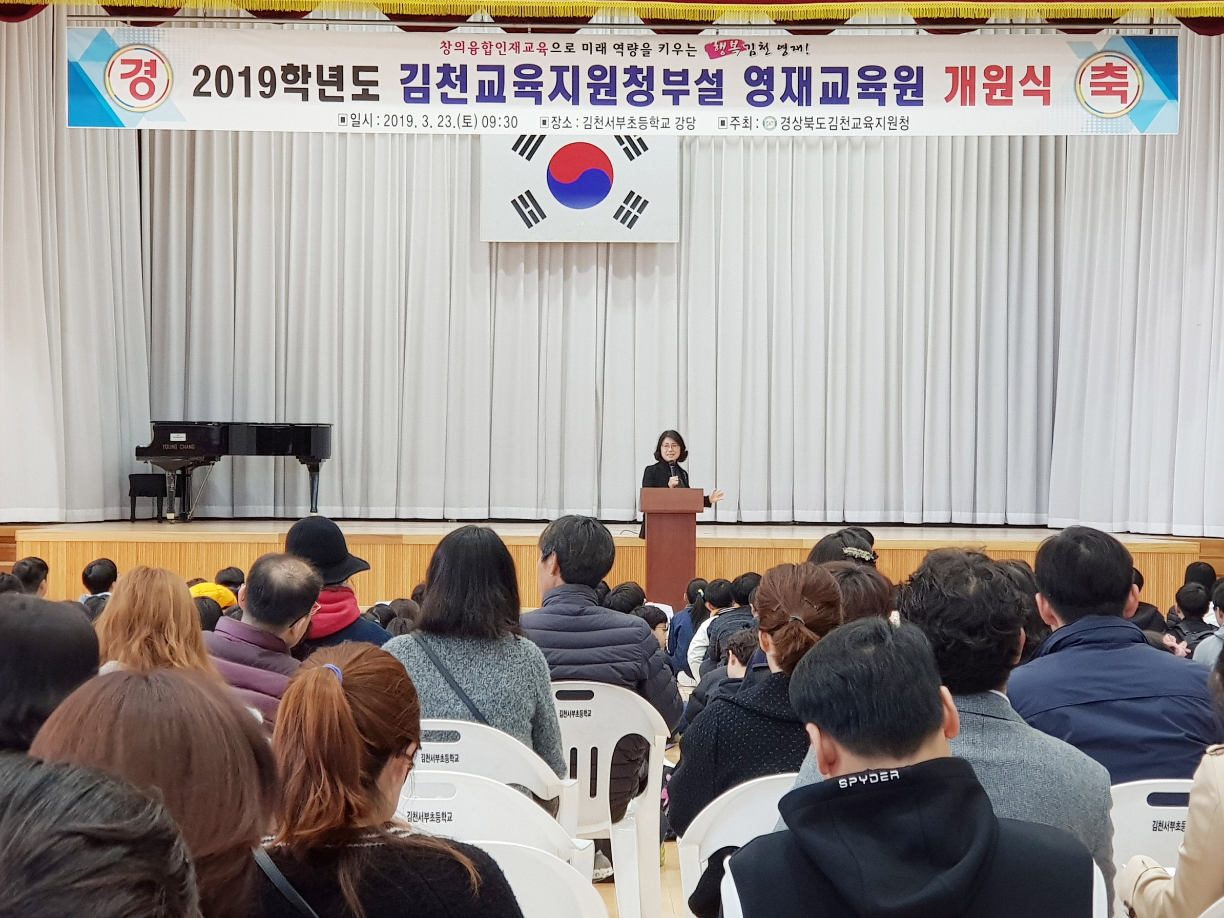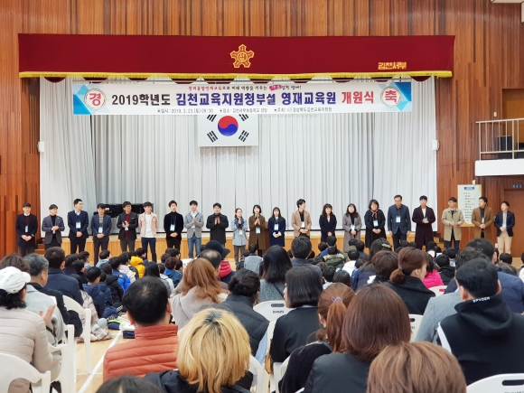 | 경상북도김천교육지원청(교육장 마숙자)은 2019학년도 김천교육지원청부설영재교육원 개원식을 지난 3월 23일 김천서부초등학교 강당에서 개최하였다. ‘창의융합인재교육으로 미래 역량을 키우는 행복 김천 영재’라는 주제로 열린 이번 개원식에는 초·중학교 영재교육원 학생 110명과 영재지도강사 35명, 학부모 100여명 등 250여명이 참석하여 영재교육원 학생들의 첫 걸음을 축하하였다.