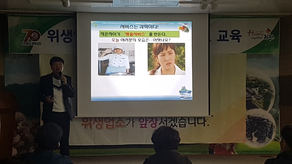 | 김천시(시장 김충섭)는 3월 27일 대항면사무소에서 직지사 상가 음식점 종사자 40명을 시작으로 28일에는 지례면 회의실에서 지례·부항·대덕·증산면 소재 음식점 종사자 80명을, 29일에는 대곡동 사무소 회의실에서 부곡맛고을 음식점 영업주 및 종사자 100명을 대상으로 친절서비스 및 위생교육을 실시한다고 밝혔다.