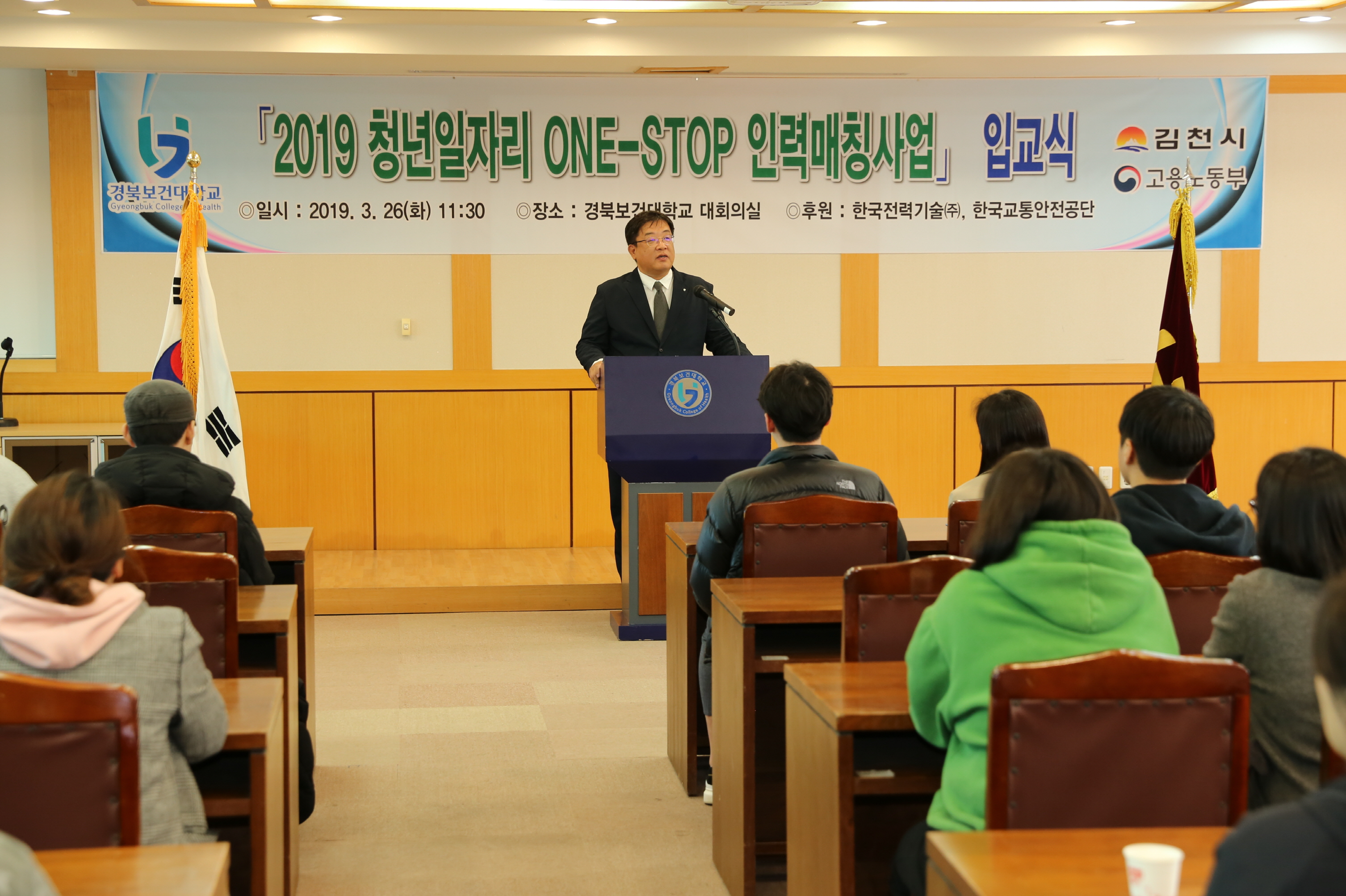 | 김천시와 경북보건대학교(총장 이은직) 산학협력단은 고용노동부가 주관하고 한국전력기술(주)과 한국교통안전공단이 후원하는 ‘2019 청년일자리 ONE-STOP 인력매칭사업’ 입교식을 26일(화) 대학본부 2층 대회의실에서 개최했다.