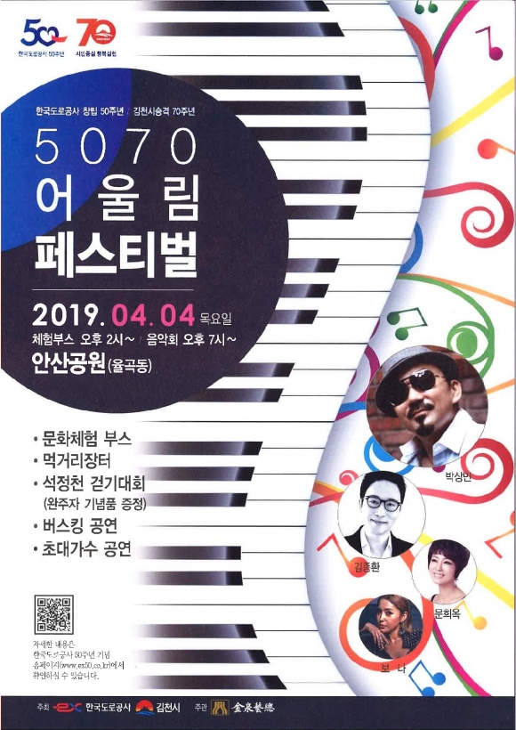 | 김천시 승격 70주년과 한국도로공사 창립 50주년을 축하하는 ‘5070 어울림 페스티벌’이 4월 4일 오후2시, 율곡동 안산공원(일원)에서 개최된다. 김천시(시장 김충섭)와 한국도로공사(사장 이강래)가 공동 주최하고 한국예술단체총연합회 김천지회가 주관하는 이번행사는 김천시 승격 70주년과 한국도로공사 창립 50주년을 함께 축하하고 혁신도시 공공기관 및 입주민과 원도심 주민들간의 어울림의 장을 통해 새로운 미래 100년을 위한 상생발전의 계기를 마련하는데 의미가 있다.