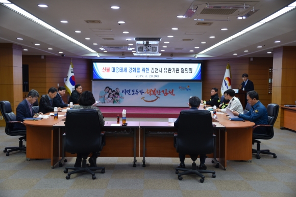 | 김천시(시장 김충섭)는 2019년 봄철 대형산불 특별대책기간을 맞아 유관기관별 구체적 임무 및 역할을 명확히 하고, 산불발생 예방 및 피해 최소화를 위한 공동대응 방안을 마련하고자 3월 28일 산불대응 태세 강화를 위한 유관기관 협의회를 개최하였다.