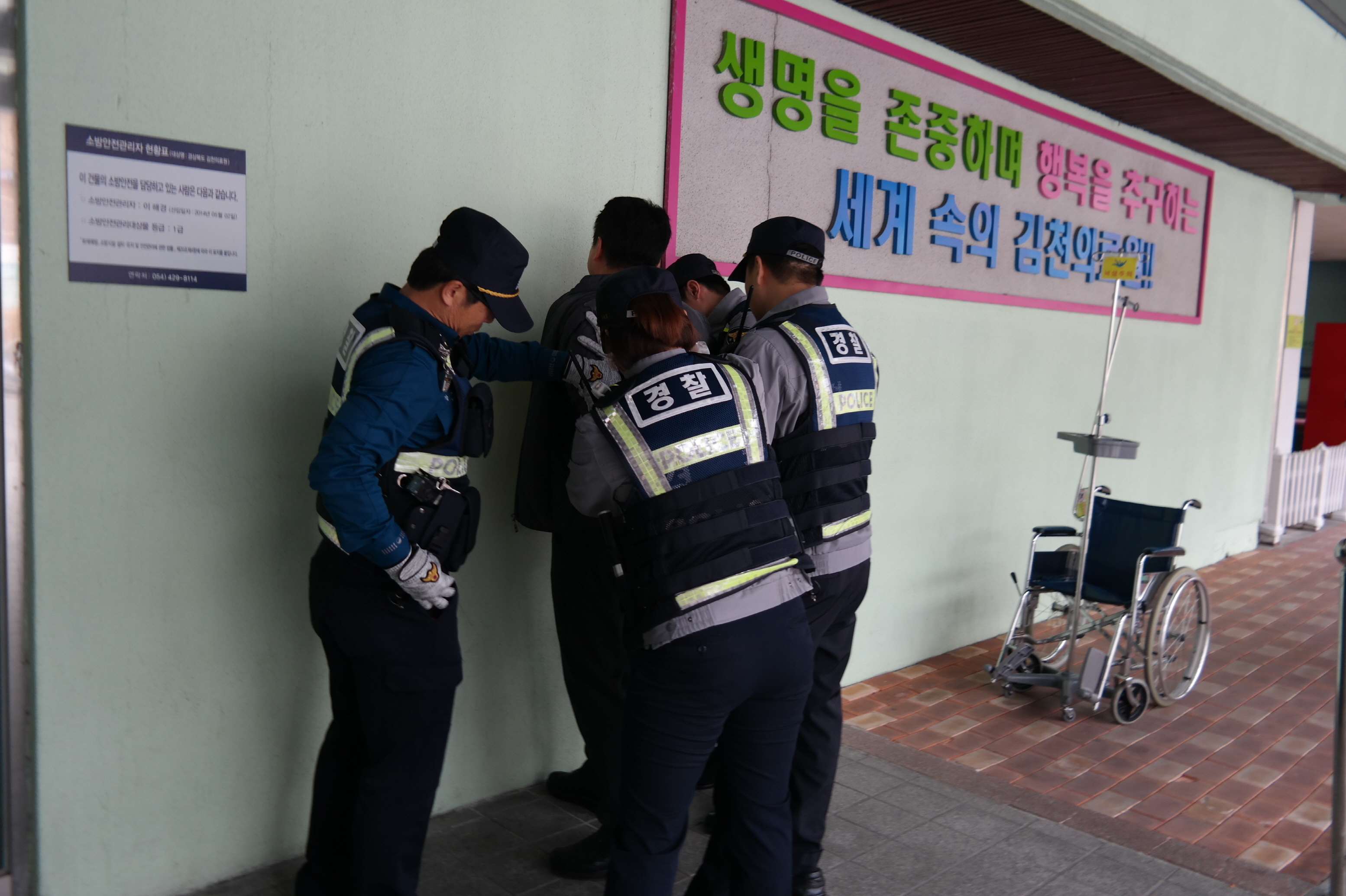 | 김천경찰서에서는 3월 29일 김천관내 응급의료기관에서 의료진 상대 폭력 등 난동행위에 강력 대응하고자 실제 상황을 가장한 모의훈련(FTX)를 실시하였다.