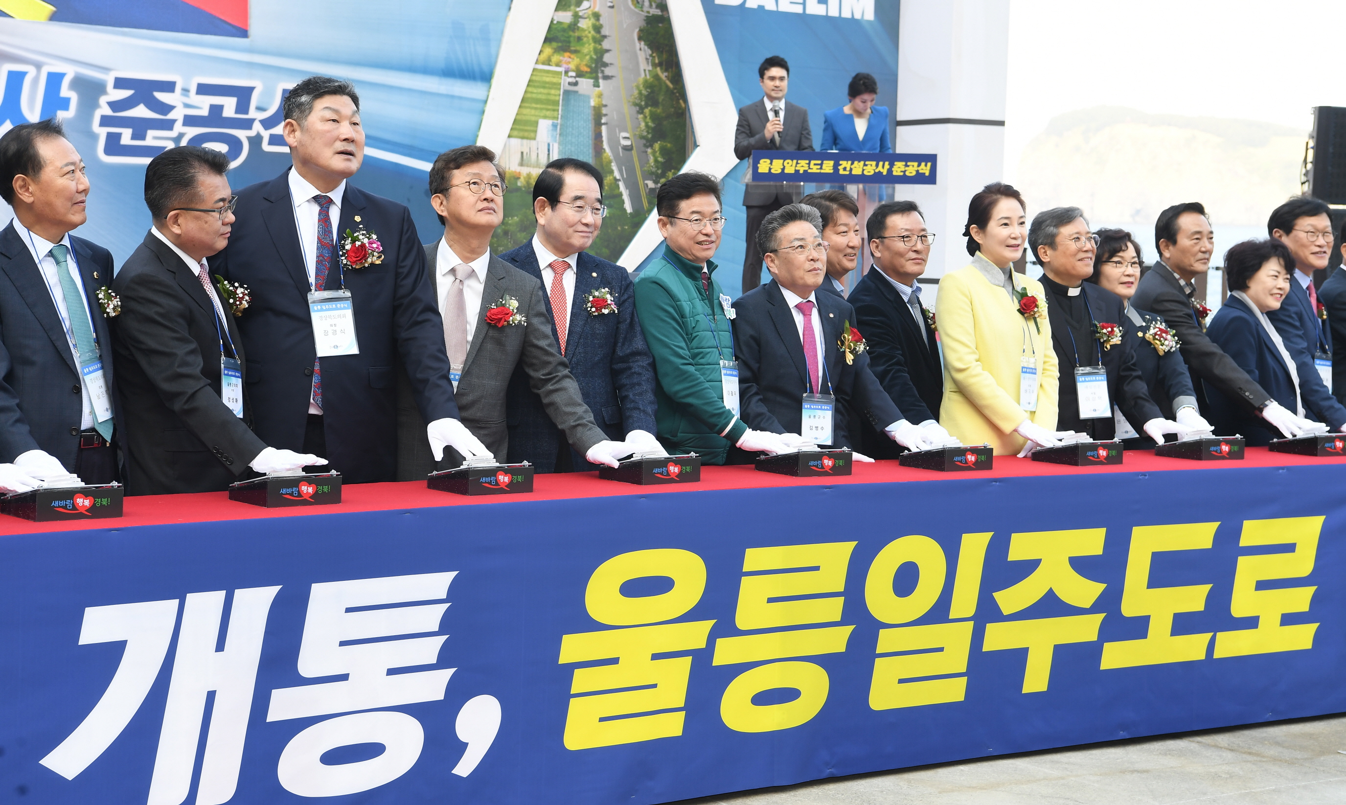 | 경상북도와 울릉군은 29일(금) 울릉군 울릉읍 저동리 와달리 휴게소에서 이철우 경상북도지사, 권영진 대구시장, 박명재 국회의원, 장경식 경북도의회 의장, 배지숙 대구시의회 의장, 임종식 경상북도교육감, 정태화 부산지방국토관리청장, 고윤환 경상북도시장군수협의회장, 심규언 동해시장, 울릉군 남진복 도의원 등을 비롯해 1,000여명의 지역주민이 참석한 가운데 ‘울릉일주도로 개통 준공식’을 축제 분위기속에 열었다.