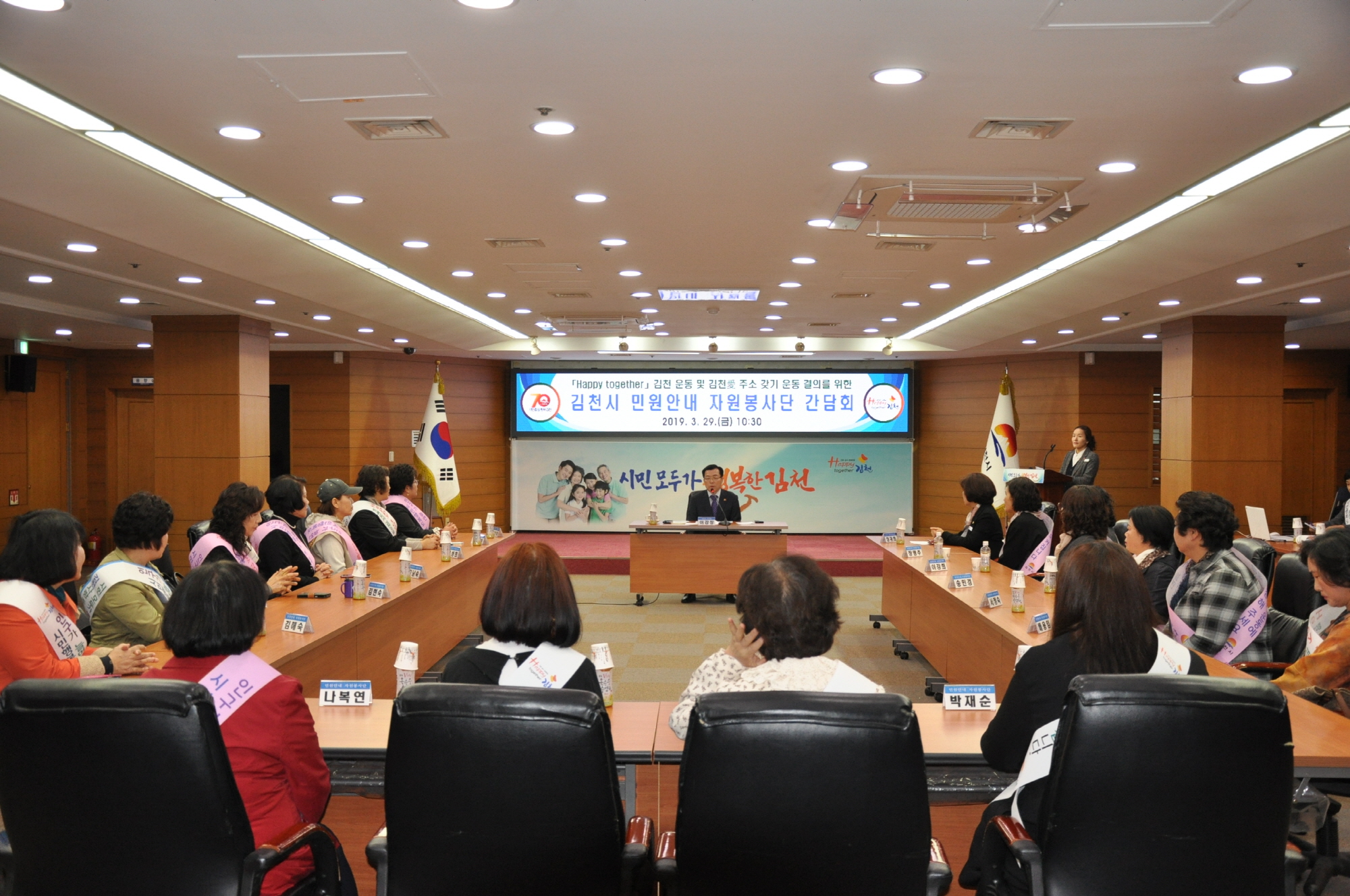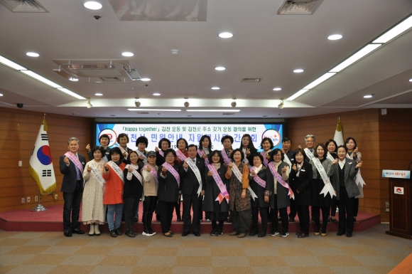 | 김천시(시장 김충섭)는 3월 29일 김천시청 2층 회의실에서 자원봉사자 20여명이 참석한 가운데「Happy together 김천」운동 적극동참 다짐결의 및 「김천시 민원안내자원봉사단 간담회」를 개최했다고 밝혔다.