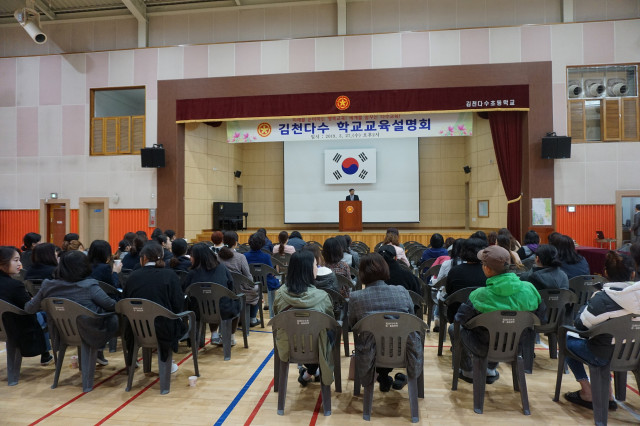 | 김천다수초등학교(교장 김한수)는 3월 27일에 꿈마루관에서 학부모들이 참석한 가운데 2019학년도 김천다수 학교교육 설명회를 실시하였다. 이날 설명회는 교직원 소개와 2019년도 학교교육계획과 관련하여 학교 교육 활동 전반에 대하여 설명회를 가졌다.