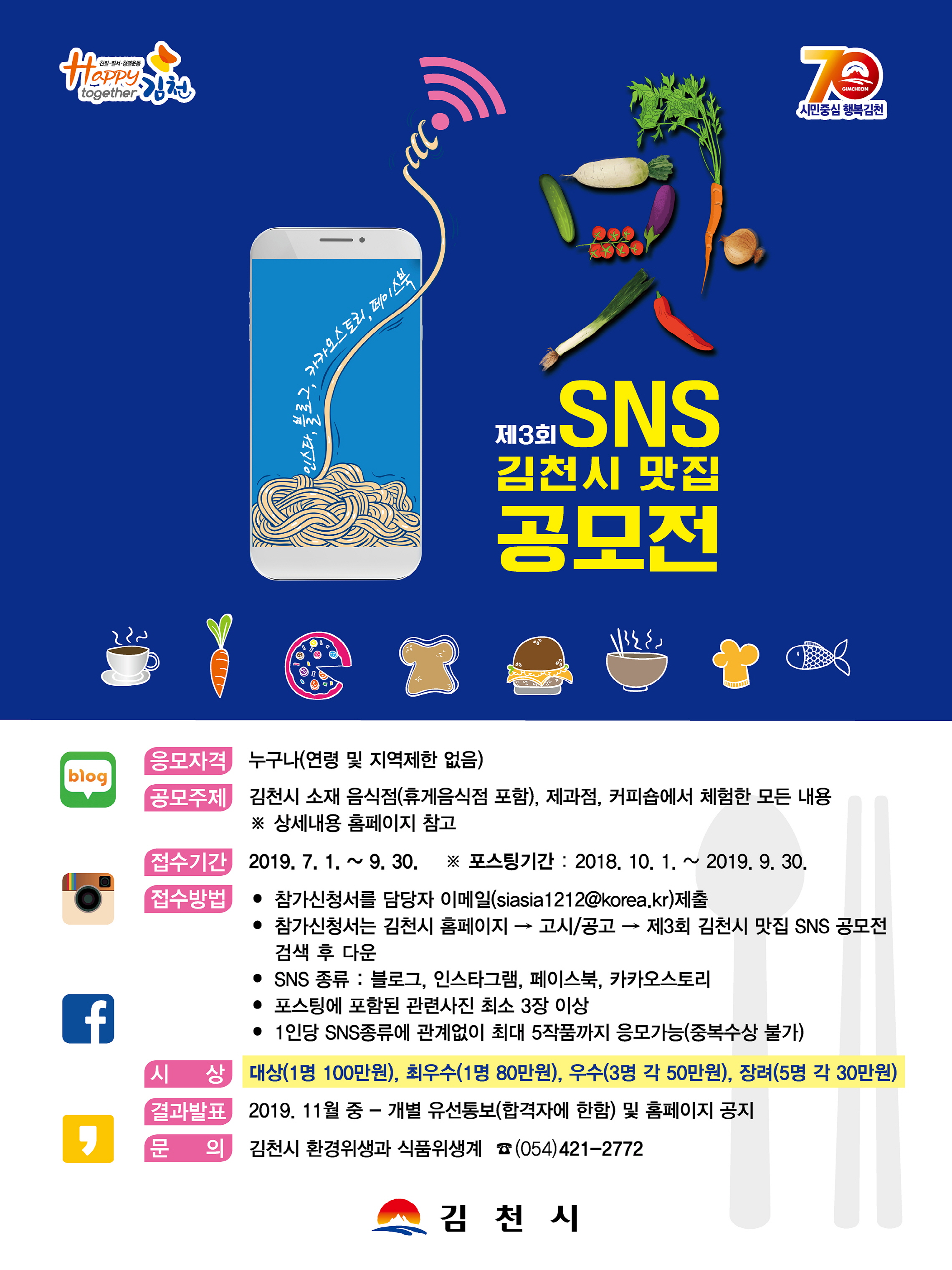 올해로 3회째를 맞이하는 김천시 맛집 SNS 공모전은 2017년 제1회 맛집 SNS 공모전은 음식문화개선사업의 일환으로 전국에서 처음으로 실시하여 응모결과 104편 접수되었고 제2회 때는 100건 접수되었는데 그중 김천시민 82건, 타 지역주민 18건이고 응모방법은 블로그 82편, 인스타그램 18편, 페이스북 2편, 카카오스토리 1편이고, 댓글 및 좋아요 4,700건, 블로그이웃이나 팔로우수 약 15,000명 정도로 김천 도시브랜드 홍보와 김천 맛집을 알리는 홍보역할을 톡톡히 하였다.