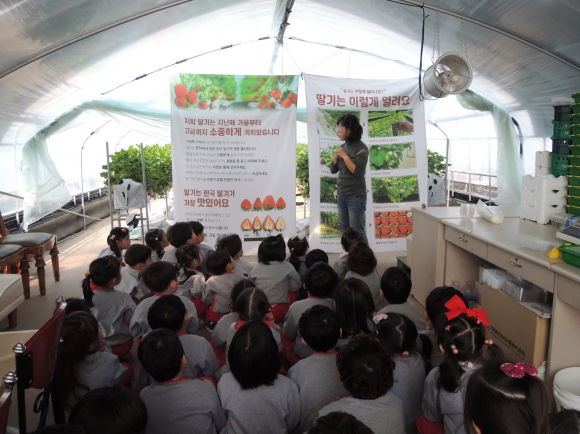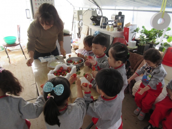 이 날 아이들은 딸기 따기 체험 외에 딸기의 성장과정과 종류 알아보기, 딸기 모종심기, 딸기퐁듀만들기 체험을 하였다.