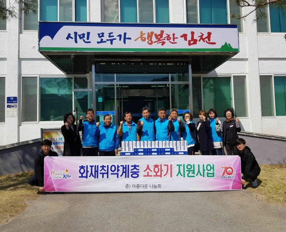 | 지례면 지역사회보장협의체는 지난 4월 2일 지례면 아름다운 나눔회(대표 문창곤)에서 기증한 소화기를 관내 화재에 취약한 독거노인 , 저소득 27가구를 찾아가 소화기 나눔행사를 실시했다.