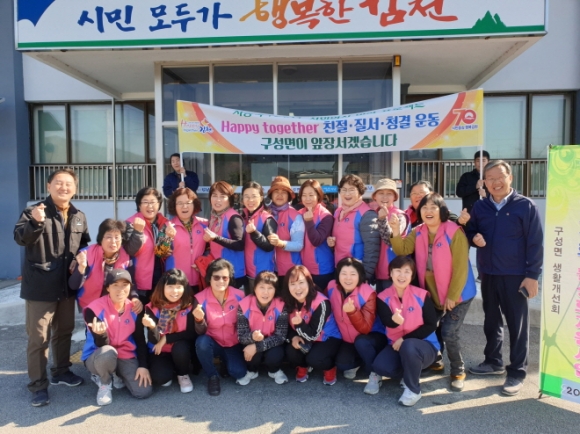 이삼근 구성면장은 “바쁜 농사철임에도 불구하고, 청결한 구성면을 위해 봉사해 주신 생활개선회 회원들에게 감사드린다. 앞으로도 『 Happy together 김천』운동을 시민중심으로 추진하여 친절·질서·청결·배려를 통한 살기 좋고 함께하는 구성면 만들기를 위해 최선을 다하겠다.”고 밝혔다.