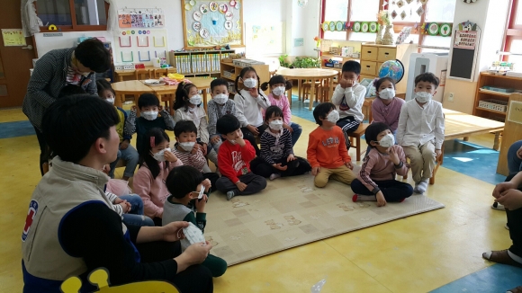 | 공립 단설 김천유치원(원장 박명희)은 만3~5세 원아들을 대상으로 지난 4월 5일에 유치원 재난안전 중 미세먼지대응교육을 실시하였다. 이 날 교육은 지역사회와 연계하여 경북보건대학교, 김천대학교 연합 봉사활동 동아리팀이 각 반에 찾아와 미세먼지 발생 시 대응요령에 대해 교육하였다.