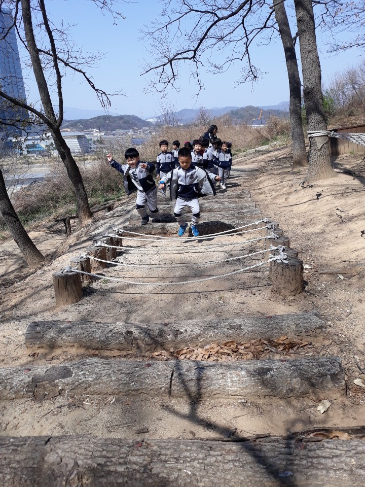 버스에서 내린 유아들은 만5세 꽃잎1반 형님들과 만3세 새싹1반 동생들이 짝을 이루어 들뜬 표정으로 숲체험원을 향해 씩씩하게 걸어 올라갔다.