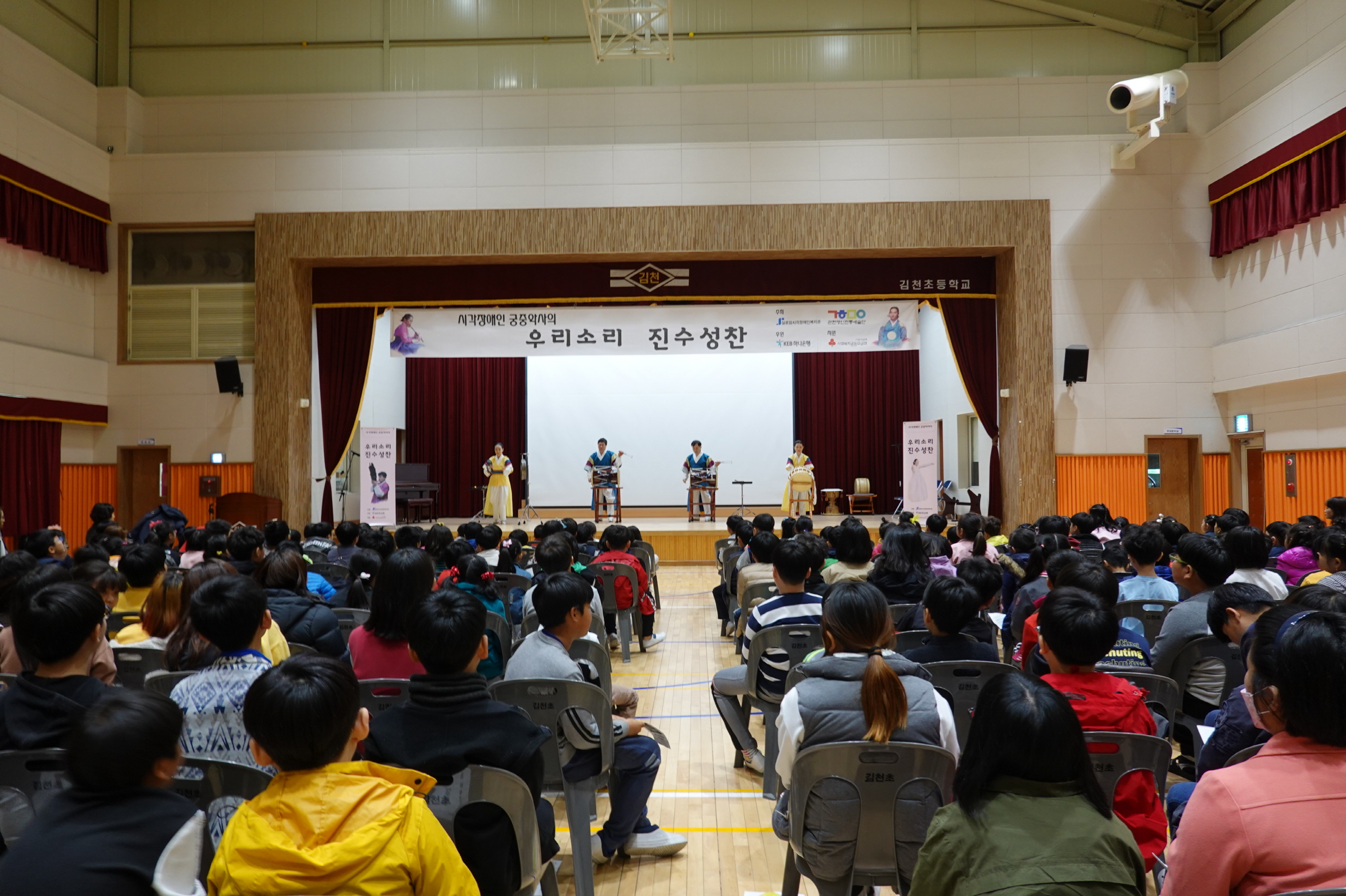 | 김천초등학교(교장 박순지)는 제39회 장애인의 날을 맞이하여 11일 본교 체육관(남산관)에서 시각장애인으로 구성된 관현맹인전통예술단을 초청하여 ‘우리소리 진수성찬’공연을 전교생이 관람하는 시간을 가졌다.
