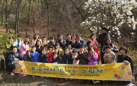 | 김천시립도서관에서는 지난 4월 14일, 유치원아 및 초등저학년생이 포함된 가족을 대상으로 우리 고장의 숲에 관한 인문학적 지식함양과 더불어 애향심을 키울 수 있는 기회를 제공하고자‘시끌벅적 우리 동네 인문학놀이터’를 운영하였다. 이 나들이는 숲속愛 대표 여해련 숲 해설가의 지도 아래, 따뜻한 봄날 고성산 황톳길을 가족과 함께 거닐면서 흙, 숲, 봄꽃 등을 벗 삼아 추억을 만들고 다양한 체험과 활동을 통해 자연의 소중함을 느낄 수 있는 내용으로 진행되었다.
