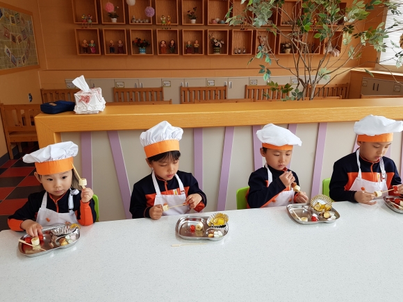 「지글보글쿡쿡」 요리영역에서 마시멜로 과일꼬지 만들기 요리활동을 하였다. 사전활동으로 유아들은 우리 몸을 건강하게 해 주는 영양소에 대해 이야기 나누어 보고, 건강한 먹거리에 대해서도 알아보았다. 다음으로 유아들은 요리사 역할 옷과 모자를 쓰고 멋진 요리사 복장을 갖춰 입고 바나나 방울토마토 마시멜로등으로‘과일꼬지’를 만들었다.