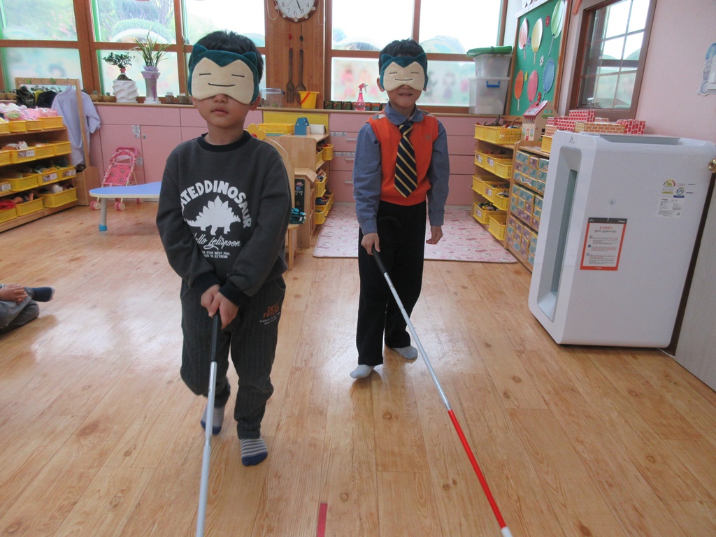 또한 휠체어와 흰지팡이 사용하기, 입과 발로 글쓰기 등의 체험활동으로 장애인이 겪는 어려움과 불편함을 직접 느껴보고, 우리 주변에 장애인의 불편함을 해소하기 위한 시설 찾아보기 등의 활동을 하였다. 유아들은 다양한 소통 방법으로 서로 배려하고 협력하며 장애인에 대한 바른 인식과 행동에 대해 생각해 보는 의미 있는 시간을 가졌다.