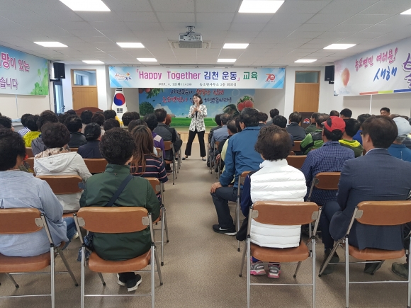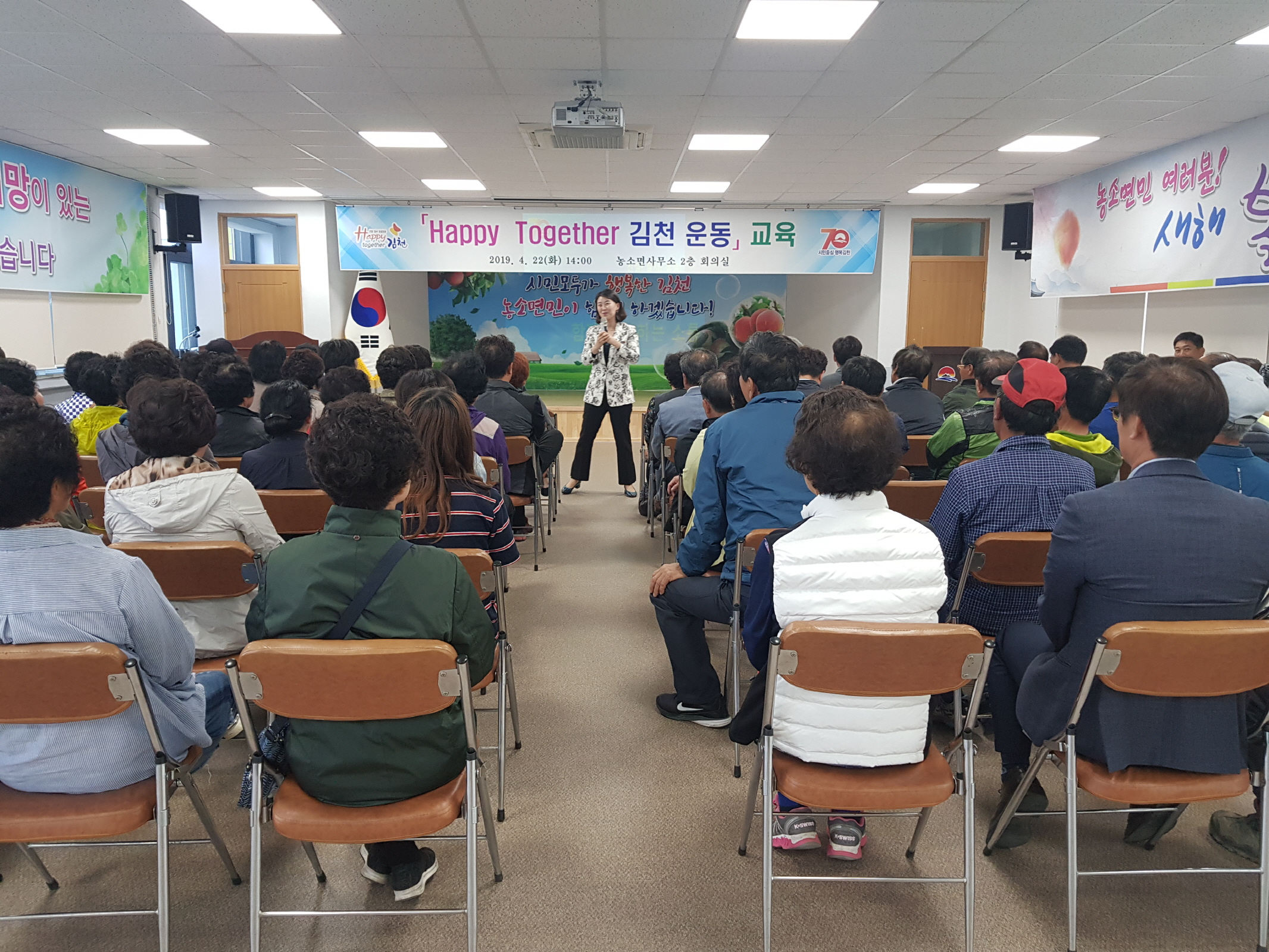 | 김천시 농소면(면장 이정하)에서는 4월 23일 Happy together 김천운동 교육을 실시하였다. 이날 교육은 <친절! 질서! 청결! 함께 변화하는 소통>이라는 주제로 박은미 Happy together 전문강사님을 초빙하여 실시하였으며 농번기로 바쁜 시기임에도 불구하고 80여명의 주민들이 참석하여 Happy together 김천 운동에 대한 이해도를 높이고 실천방안에 대해 재미있게 풀어나가는 시간이 되었다.