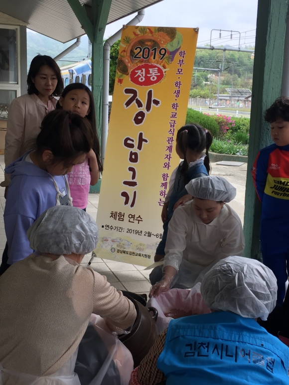 | 경상북도김천교육지원청(교육장 마숙자)은 지난 2월에 장을 담군지 50여일 만에 함께 담근 학생·학부모 60명이 모여서 2019년 4월 23일부터 24일 양일간에 걸쳐 김천시니어클럽 마마된장사업단에서 된장과 간장을 나누는 장가르기 체험 연수를 실시했다. 장 가르기 체험 연수는 맑게 잘 익어준 간장은 옮겨담고 발효된 건더기는 잘게 부수어서 장물을 부어가며 다시 항아리로 들이고 된장 위에 소금을 쫌 뿌려 주었다.