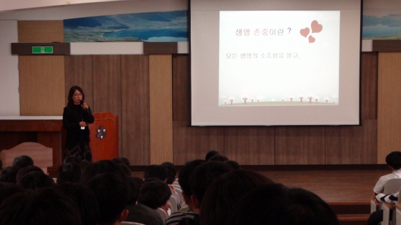 | 성의중학교(교장 안중기)는 4월 24일 교내 시청각실에서 전교직원 및 전교생을 대상으로 생명존중 및 학생자살예방교육을 실시하였다. 포항생명의 전화 소속 이미정 팀장의 특강으로 학생들에게 생명을 사랑하고 자살에 대한 잘못된 인식을 바로 잡아 생명을 존중하는 분위기 조성의 계기가 되었다.