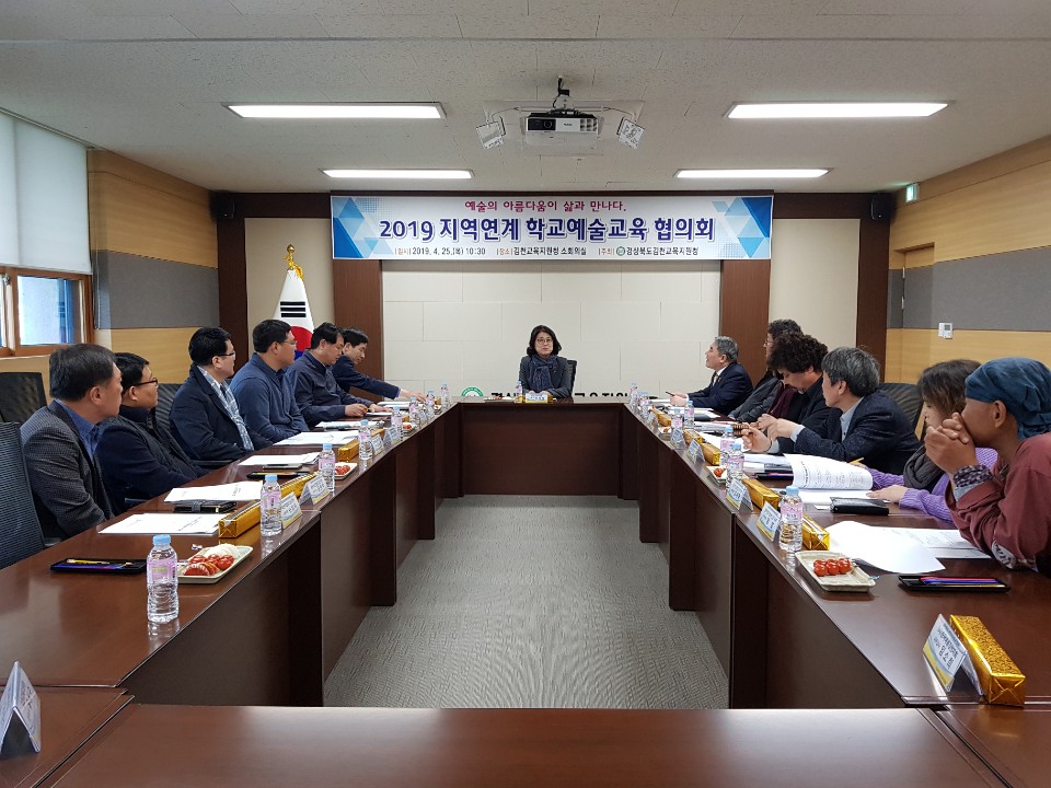 | 경상북도김천교육지원청(교육장 마숙자)은 4월 25일 김천교육지원청 소회의실에서 11개 문화예술 단체를 대상으로 2019 지역연계 학교예술교육 활성화를 위한 협의회를 실시하였다. 이번 협의회는 김천교육지원청, 김천시청, 김천대학교, 김천예총, 문인협회, 음악협회, 국악협회, 미술협회, 사진협회, 연극협회, 연예협회 관계자 등 24명이 참석하였다.