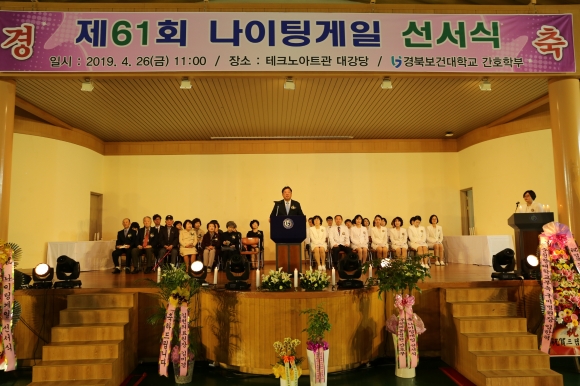 | 경북보건대학교(총장 이은직) 간호학부는 4월 26일 본교 대강당에서, 간호학과 3학년 학생들이 예비 간호사로 첫 걸음을 내 딛는 ‘나이팅게일 선서식’을 개최했다.
