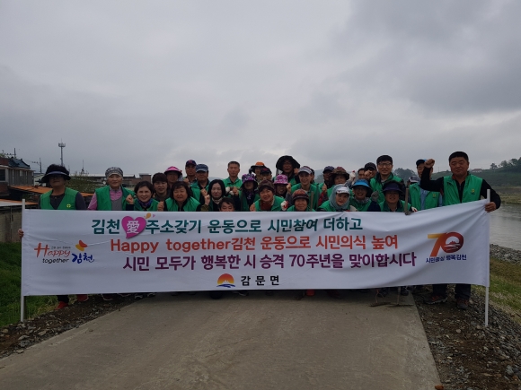 직접 현장을 찾은 김윤수 감문면장과 김세운 의장은 “농번기에도 불구하고 Happy together김천 청결운동과 함께 아름다운 감문 만들기에 열정적으로 힘을 보태주신 새마을 회원분들에게 감사드린다. 여러분들의 땀 흘린 오늘이 감문면민들뿐 아니라 감문을 찾는 내방객들에게 아름다운 볼거리를 줄 수 있고, 더 나아가 배시내지역 상권 활성화도 기대해 볼 수 있겠다”고 말하며 새마을회원들을 격려하고, 지속적인 관리와 관심을 당부하며 지금처럼 늘 면민행사에도 적극 동참해 줄 것을 당부했다.