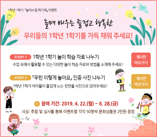 또한 놀이수업 학기제의 활성화 및 자료 공유를 위하여 수업나누리(http://nanuri.gyo6.net)를 통하여 1학년 1학기 놀이학습 자료와 ‘우린 이렇게 놀아요’ 인증 사진 나누기 행사를 실시하고 있다.